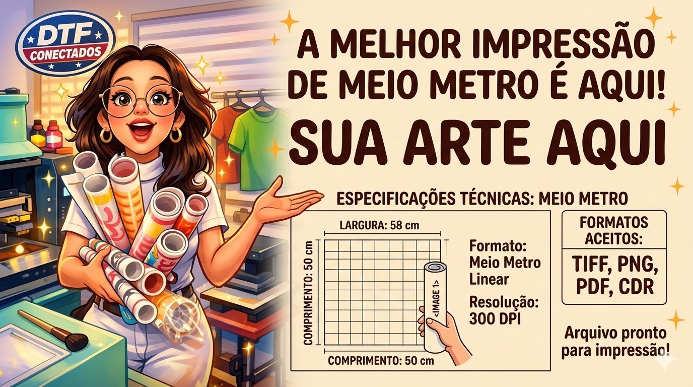 DTF significa Direct to Film (direto no filme). É uma tecnologia que permite imprimir imagens com alta definição em filmes, que depois são transferidos para tecidos com excelente durabilidade.